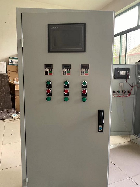 PLC觸摸屏變頻控制柜中包括裝置本體,裝置本體的頂部設(shè)置有頂板,頂板采用軟塑鋼材料制成的,其表面涂有防腐蝕涂料,裝置本體的正面設(shè)置有柜門,柜門表面安裝有液晶觸控屏,液晶觸控屏采用電容屏幕制成,PLC控制器與觸摸顯示屏相連接,傳感器安裝在供水管路上,變頻器與供水泵組相連接。 液晶觸控屏的底部設(shè)置有若干控制按鍵,控制按鍵與裝置本體信號相連接,裝置本體的底部設(shè)置有底板,底板的下部安裝有減震裝置,減震裝置的底部設(shè)置有底座,裝置本體的右側(cè)面裝設(shè)了警報燈,警報燈和裝置本體的信號相連接,裝置的本體里部裝設(shè)了若干掛板,掛板與裝置本體無縫焊接,掛板表面預(yù)留有若干掛鉤孔, 該P(yáng)LC觸摸屏變頻控制柜控制方便,安全性能越高,通過PLC可以支持遠(yuǎn)程控制,使用效率越高,使設(shè)備運行流程及運行狀況簡潔明了、形象直觀,各功能模塊及報警情況一目了然,方便使用和檢修,節(jié)能效果越加顯明。