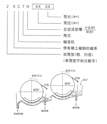 該設(shè)備有單簡型及雙筒兩大類,其分選區(qū)的磁感應(yīng)強(qiáng)度可根據(jù)用戶的需要確定。對(duì)雙筒型磁選機(jī)而言,一臺(tái)設(shè)備完成粗、掃選作業(yè),設(shè)計(jì)中充分考慮;兩段選別的不同磁場(chǎng)特點(diǎn),設(shè)計(jì)了不同的磁場(chǎng)結(jié)構(gòu),以滿足工藝要求。